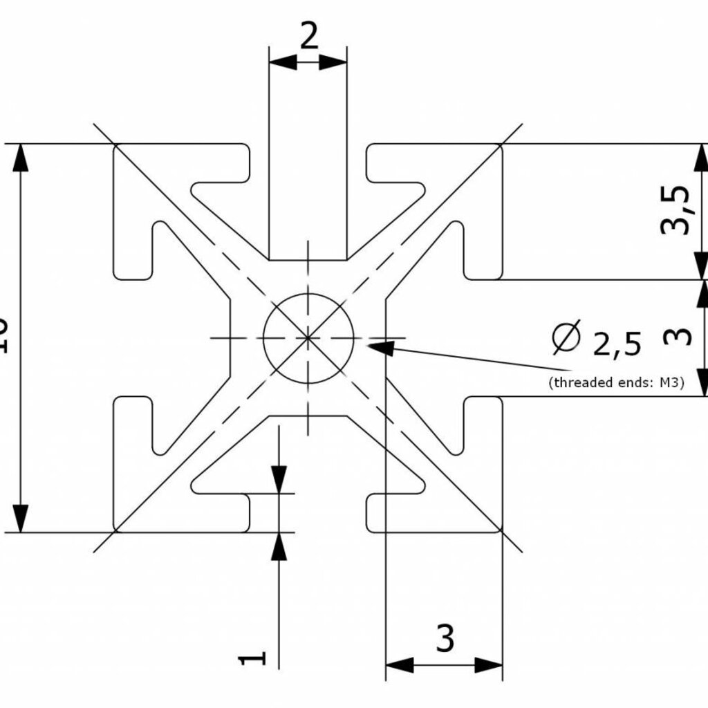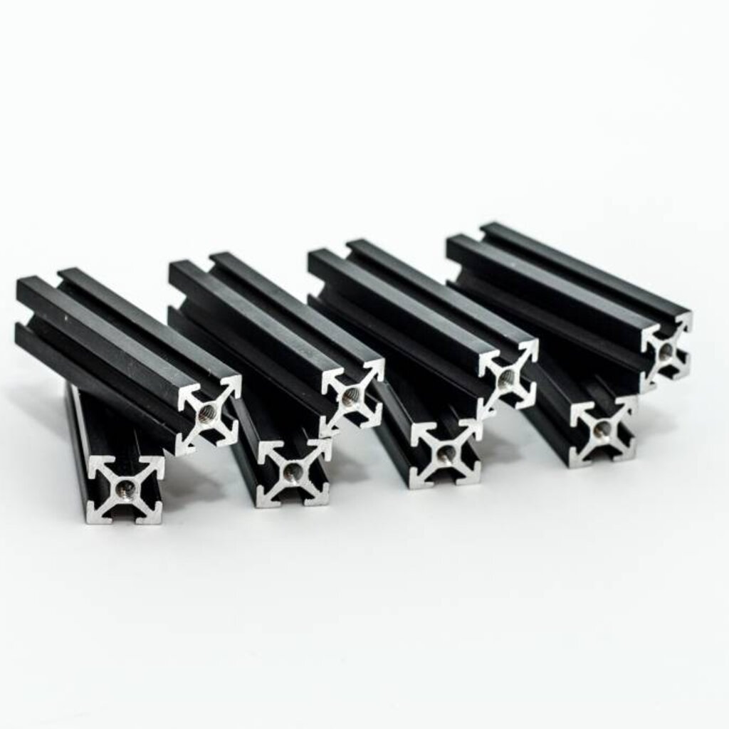 8 pieces of 40mm black anodised MakerBeam. MakerBeam width and height = 10mm x 10mm. We have drawings available (.STP, .DXF, .PDF)